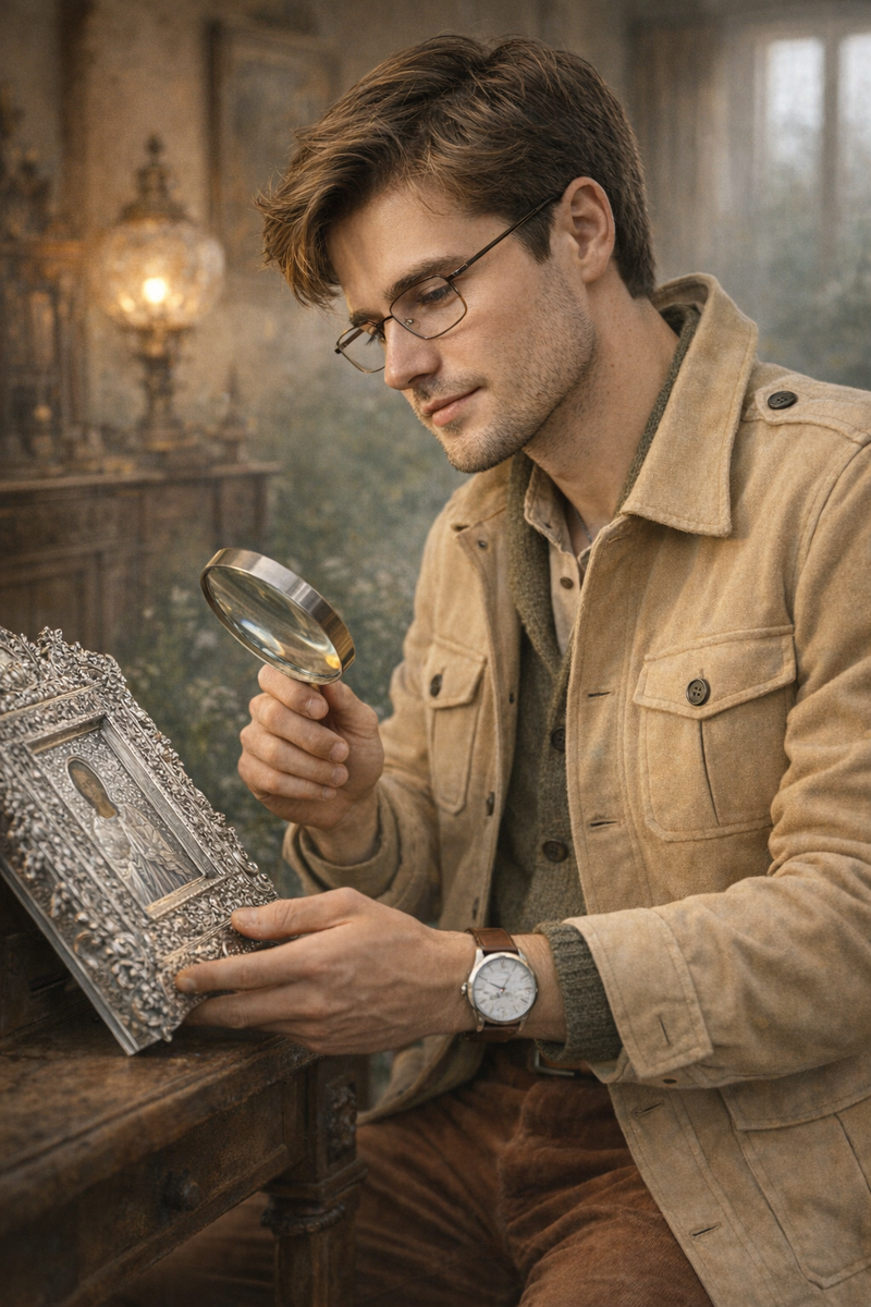Трасса М-7 «Волга» в сторону Владимира всегда настраивает на рабочий лад. В этот раз я отправился на поиски «серебряного списка» одной аристократической семьи. Мой имидж — куртка в стиле сафари и кожаная сумка-мессенджер — идеально подходит для таких выездов: практично, уверенно и с уважением к традициям. По пути я заехал в гости к Павлу, директору небольшого частного музея. Мы знакомы давно, и его советы часто помогали мне в атрибуции сложных предметов. Мы обедали в тихом местечке у Золотых ворот, обсуждая, как в 2025 году цифровой след персонажа помогает находить реальные сокровища. Павел — один из немногих, кто понимает мой этический кодекс: арт-хантер должен в первую очередь быть хранителем, а не торговцем. Интрига этой поездки заключалась в том, что предмет пытались выкупить за бесценок недобросовестные дилеры. Я приехал, чтобы провести независимую экспертизу. В старом доме на окраине Владимира я увидел его — серебряный оклад, чья патина буквально дышала историей. Используя св
