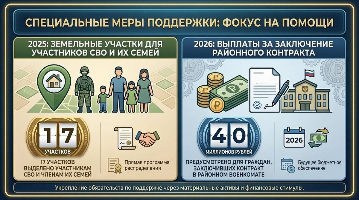 В 2025 году 17 земельных участков получили участники СВО и члены их семей. Кроме того, на 2026 год предусмотрено 40 миллионов рублей на выплаты гражданам, заключающим контракт в военкомате округа. #отчетглавыокруга