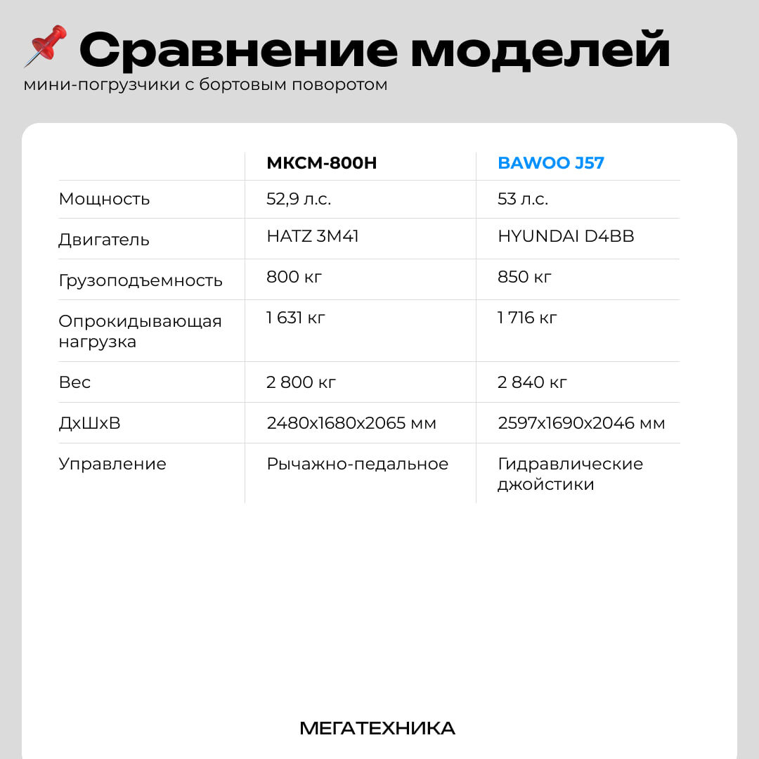 Отечественная классика или технологичный “кореец”? Не спешите с выбором: сегодня сравниваем две популярные модели, чтобы наглядно увидеть разницу. Двигатели моделей практически одинаковы: в МКСМ-800Н стоит Hatz 3М41 мощностью 52,9 л.с., а в BAWOO J57 - Hyundai D4BB мощностью 53 л.с. Однако следует учесть, что двигатель Hyundai популярнее, что означает его большую сервисную пригодность. По грузовым показателям “кореец” немного обгоняет российского товарища: грузоподъемность 850 кг против 800 кг, опрокидывающая нагрузка - 1716 кг против 1631 кг. Кроме того, BAWOO J57 тяжелее - 2840 кг против 2800 кг, немного длиннее и ниже своего коллеги. Это влияет на устойчивость и функциональность. МКСМ-800Н управляется рычагами и педалями, что влияет на плавность и требует особых навыков оператора. В кабине BAWOO J57 - гидравлические джойстики, которые интуитивно понятнее и позволяют управлять машиной более плавно. Кроме того, кабина МКСМ-800Н небезопасна для оператора, т.к. в ней нет специальных защ