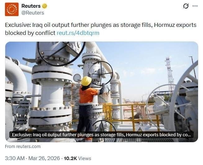 баррелей в сутки из-за заполнения хранилищ и блокировки экспорта через Ормузский пролив, сообщает Reuters со ссылкой на иракских чиновников До войны добыча на южных месторождениях составляла 4,3 млн баррелей в сутки. Ранее в марте она уже снижалась на 70%, а теперь сократилась ещё больше. Ирак попросил British Petroleum(BP) снизить добычу на месторождении Румайла на 100 тыс. баррелей в сутки, а итальянскую Eni(ENI.MI) на Зубаире — на 70 тыс. баррелей в сутки. Иракские энергетические чиновники предупредили: если кризис в Ормузском проливе не разрешится, возможны новые сокращения. 🔴 Читайте Sputnik Беларусь в MAX