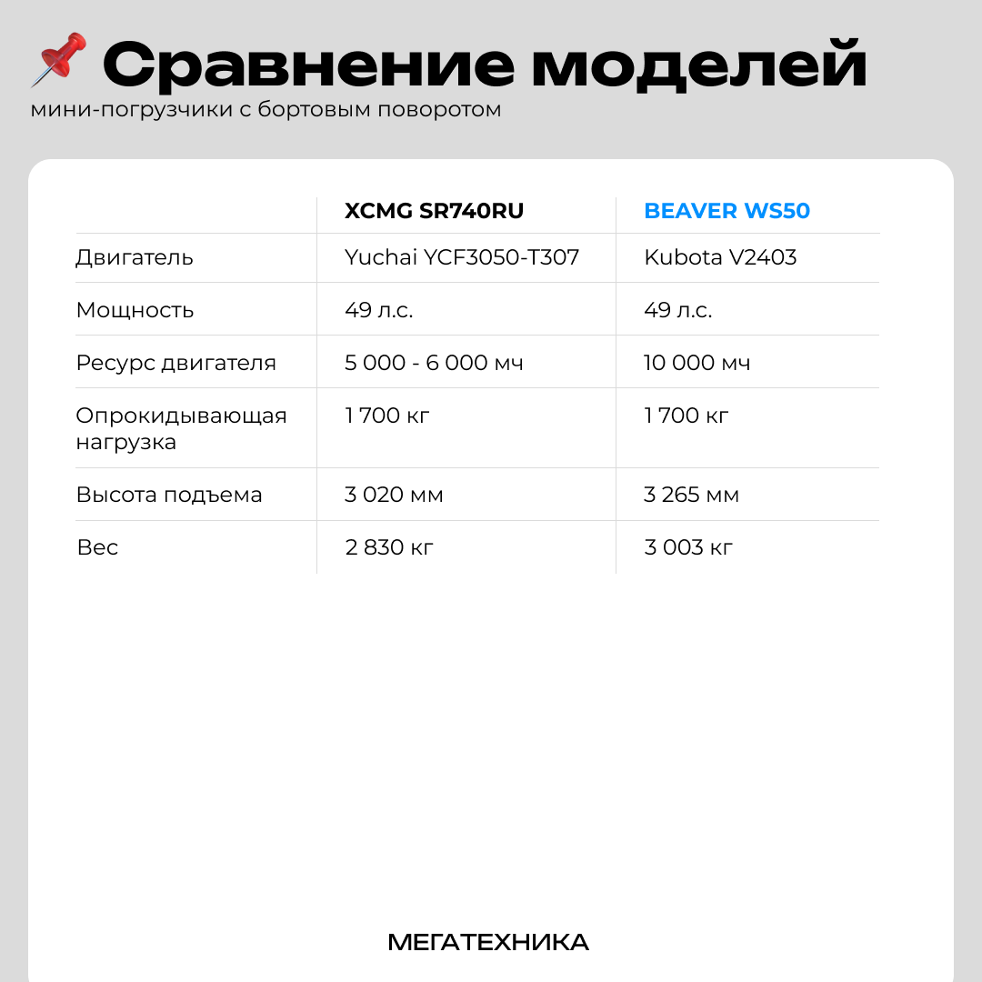 Оба из Китая, оба имеют схожие показатели мощности и тип подъема, однако различия между ними фундаментальны. Сегодня разбираемся в особенностях двух мини-погрузчиков - XCMG SR740RU и BEAVER WS50. Двигатели моделей принципиально отличаются: BEAVER оснащен японским дизельным двигателем Kubota V2403 с ресурсом до 10 тыс. моточасов, отличной экономичностью и стабильной тягой на любых оборотах. А в XCMG SR740RU стоит китайский Yuchai YCF3050-T307 с ресурсом в 2 раза ниже, более чувствительным к перегрузкам и перегревам, с плохой переносимостью низких температур и высоких оборотов. Высота подъема тоже отличается: у BEAVER это 3265 мм, а у XCMG - 3020 мм. Эта разница позволяет BEAVER работать со вторым ярусом паллетов, легко загружать высокобортные самосвалы и контейнеры, а также использовать бур, манипулятор и вилы. Опрокидывающая нагрузка у мини-погрузчиков одинаковая - 1700 кг. Однако BEAVER тяжелее и весит 3003 кг, а XCMG SR740RU - 2830 кг. Это говорит об устойчивости и высокой безопаснос