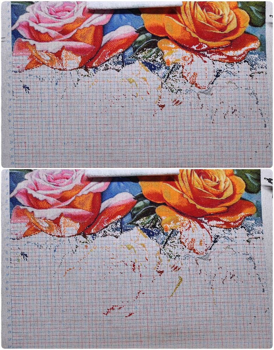 Продолжаю работать над розами. Добавилось 1055// И я, в аккурат, закончила 11й ряд! Переходу на 12й, справа налево. В этом ряду тоже много пробелов, но это еще ни о чем не говорит. Кто давно знаком с моей деятельностью, смотрел ранние видео и читал записи, знают, что я многое перепробовала в плане методов вышивки. Чем мне так понравился такой способ брать цвета, рядочками, так это тем, что не ощущаешь сложности некоторых участков. Если вышиваешь просто фрагментами, то сначала ты какое-то время мучаешь одиночки и маленькие группки, потом быстро шьешь большие участки. Или наоборот, если от большего. Даже если шить в каком-то другом порядке, все равно ограничен областью. Пусть тут тоже не будут ощущаться периоды, сложные и легкие, но зато будет ограничение области и внеплановые смены нити. А тут нет никаких ограничений. Одиночки и мелкие группки перемешиваются с большими легкими участками, а за счет постоянной перемотки, всегда есть место, где дошивать ниточку. В редких случаях получается