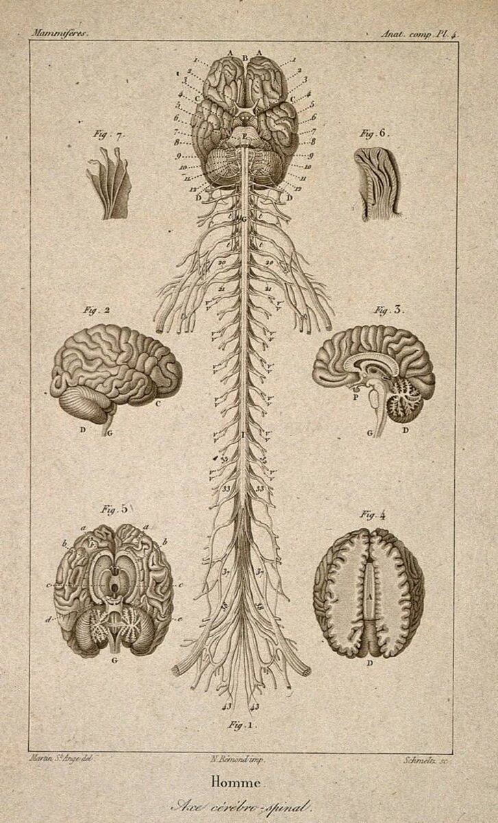 Гравюры из анатомического пособия Мартина Сен-Анжа, всей центральной нервной системы: головного и спинного мозга, как их видели анатомы между 1830 и 1850 годами