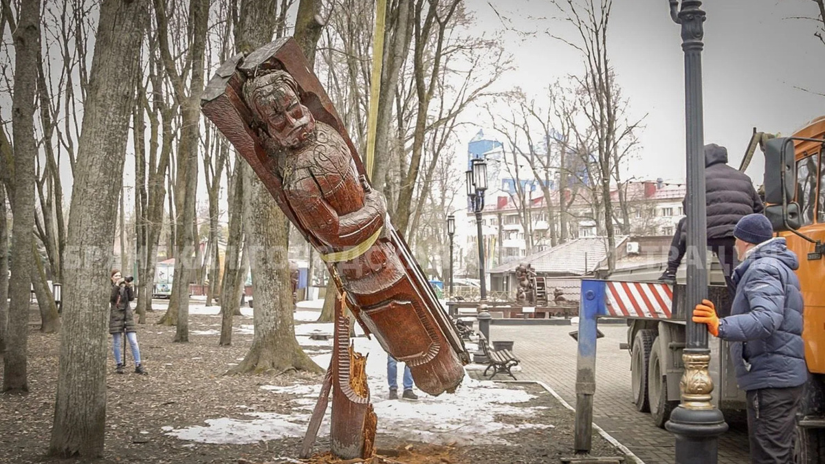 В парке-музее имени Толстого Брянска 26 марта демонтировали одну из старейших деревянных фигур - скульптуру князя Романа Брянского. Резчик по дереву Владимир Орлов создал её в тысяча девятьсот семьдесят восьмом году. Почти полвека удавалось сохранять её первозданный облик благодаря регулярной реставрации. Однако дерево в центральной части скульптуры всё же разрушилось. Очередная экспертиза констатировала - восстановить произведение невозможно. Тогда и было принято решение создать новую деревянную скульптуру. Эскиз разработал брянский мастер Андрей Вишневский. Перед ним стояла задача создать сказочно-исторический образ защитника Брянской земли. Именно в период правления князя Романа Брянск стал одним из важнейших центров средневековой Руси, столицей огромного Черниговского княжества. Отсылок к прошлому исторической личности очень много в мелких деталях новой фигуры. Так, в основании четырёхметровой скульптуры видны силуэты корабля и городских построек, а шапка и меч выступают символами
