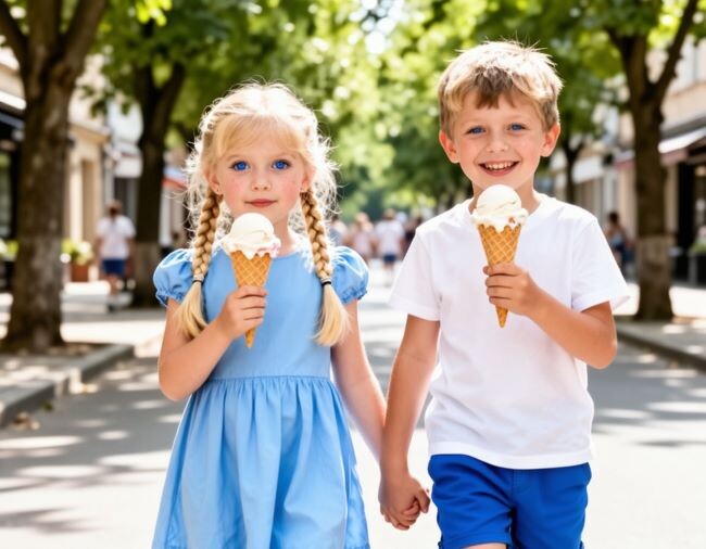 Еремей и Маруся днями напролёт не разлучались. Однажды гуляя на игровой площадке и вдоволь набегавшись, Маруся попросила Еремея вместе сбегать за мороженным. Так хочется в жаркий день вкусить прохладного и вкусного лакомства. Маруся, изнывая от жажды, упросила Еремея: