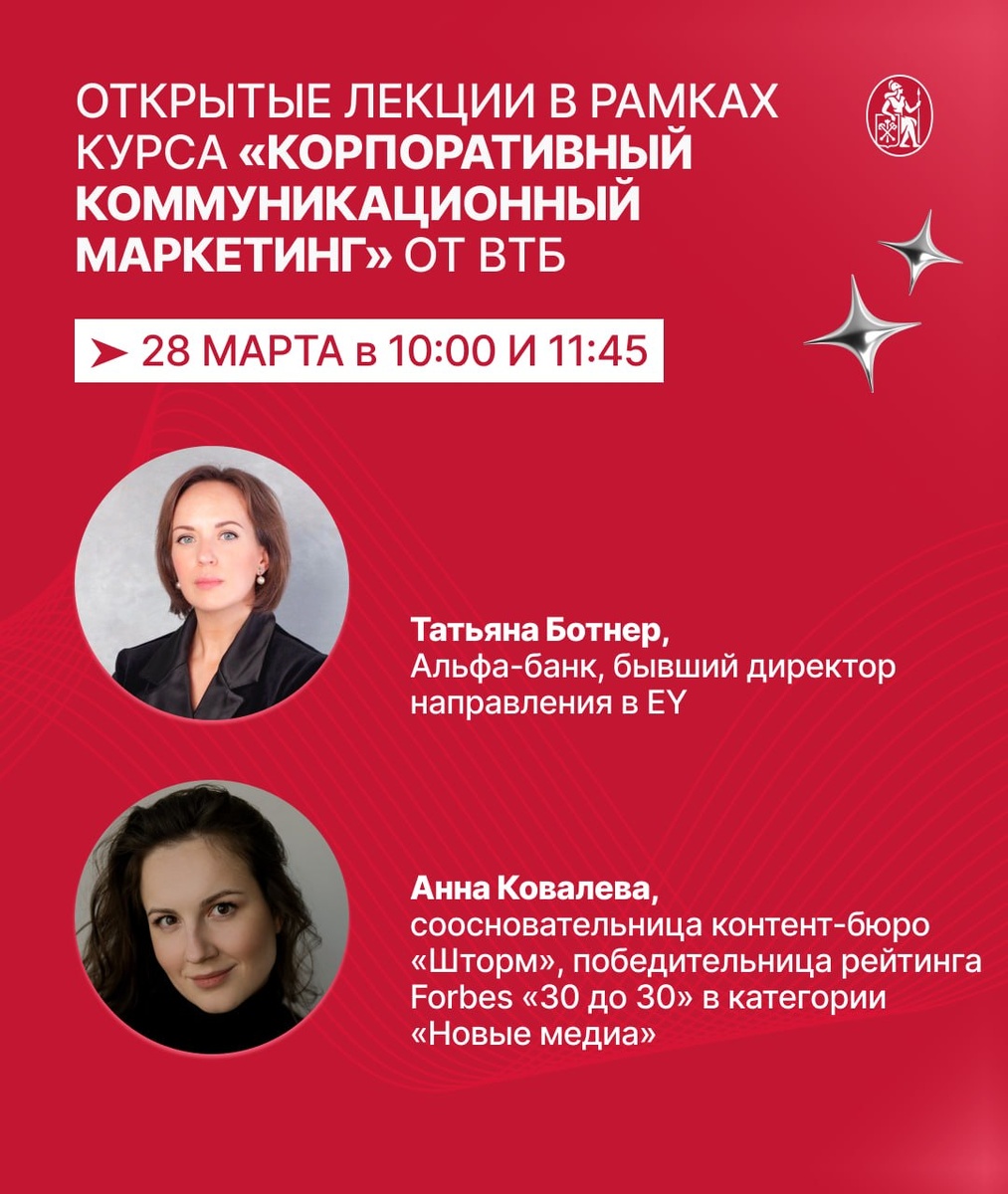 Разбираем B2B-коммуникации, карьеру маркетолога и роль новых медиа. ⏰ 10:00–11:30 | ауд. 1207 Татьяна Ботнер (проведёт лекцию очно) Руководитель международного проекта (Альфа-Банк), бывший директор департамента развития бизнеса EY Тема лекции: The human element: decoding the B2B buying committee (Когда бизнес решают люди: расшифровывая механику B2B взаимодействия) Эффективные коммуникации на B2B-рынке на примере реальных проектов EY. О том, как строится карьера в business development в B2B сегменте и почему relationship management играет ключевую роль в продажах и продвижении услуг. — ⏰ 11:45–13:15 | ауд. 1207 Анна Ковалева (проведёт лекцию онлайн) Соосновательница контент-бюро «Шторм», победительница рейтинга Forbes «30 до 30» в категории «Новые медиа» Тема лекции: Building a Career in Marketing & Communications Without a Playbook — and Not Losing Yourself Along the Way (Построение карьеры в маркетинге и коммуникациях без готовых решений — и как не потерять себя на этом пути)