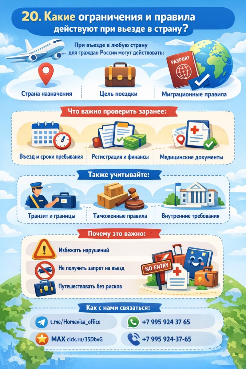 Какие ограничения и правила действуют при въезде в страну? При въезде в любую страну для граждан России могут действовать ограничения и обязательные правила. Они зависят от: страны назначения цели поездки текущего миграционного режима Что важно проверить заранее: правила въезда и выезда сроки допустимого пребывания требования к регистрации финансовые подтверждения медицинские документы Дополнительно могут действовать: транзитные ограничения особенности прохождения границы таможенные правила внутренние миграционные требования страны Почему это важно: Предварительное изучение правил позволяет: избежать нарушений не получить штрафы или запрет на въезд спокойно пройти границу без рисков Как с нами связаться: 🌙 Telegram: https://t.me/Homevisa_office 💻 WhatsApp: https://wa.me/+79959243765 ⭐️ MAX: https://clck.ru/3SDbvG 🏠 Звонки: +7 995 924-37-65