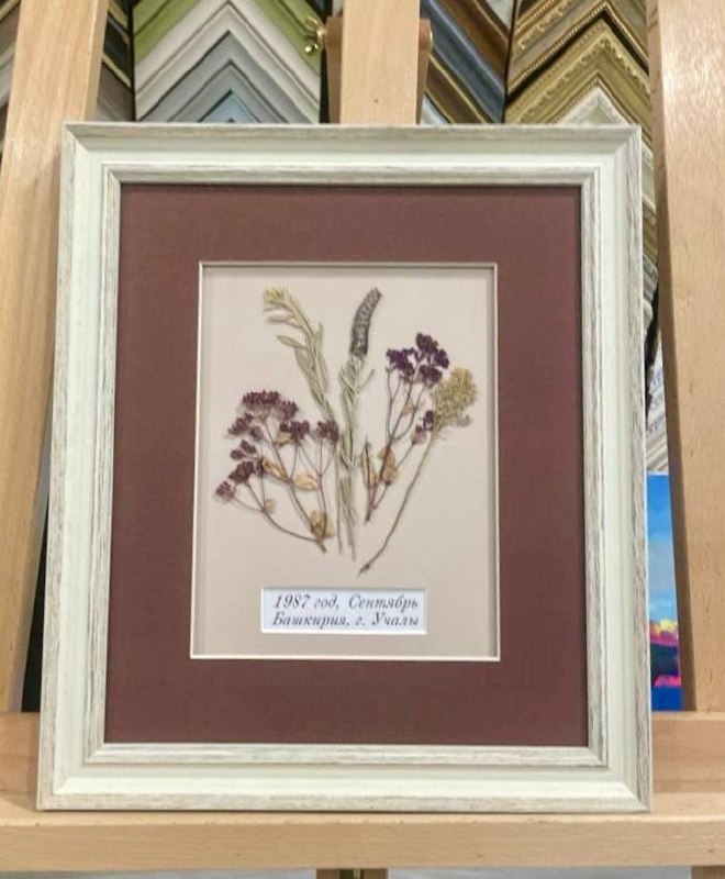Или оформление гербария в багет 🌿 Надежда приходила к нам ещё до пандемии — тогда «Багетка» находилась на Сивцевом Вражке. Мы оформляли для неё акварели…🎨 И помню, в разговоре вдруг прозвучало: — А можно оформить гербарий в багет? — Конечно, приносите — оформим. И вот проходит время… Сколько? Пять лет? А может, и больше ⏳ Сколько воды утекло. И вот Надежда возвращается. Приносит полевой дневник Академии наук СССР — а внутри сухоцветы 📖🌿 И рассказывает историю. В 1987 году её супруг был в геологической экспедиции в Башкирии, в городе Учалы. Оттуда он и привёз этот дневник — с теми самыми растениями. Недавно у него был юбилей — 80 лет 🎉 И эти сухоцветы, которые ждали своего часа 39 лет, стали подарком. Честно — это одна из самых трогательных историй, с которыми нам доводилось работать. ⸻ Об оформлении Мы сделали двойное паспарту: внешнее — слегка приподнято. Это создаёт глубину и подчёркивает композицию. Для визуального и эстетического эффекта, а также с учётом техническ