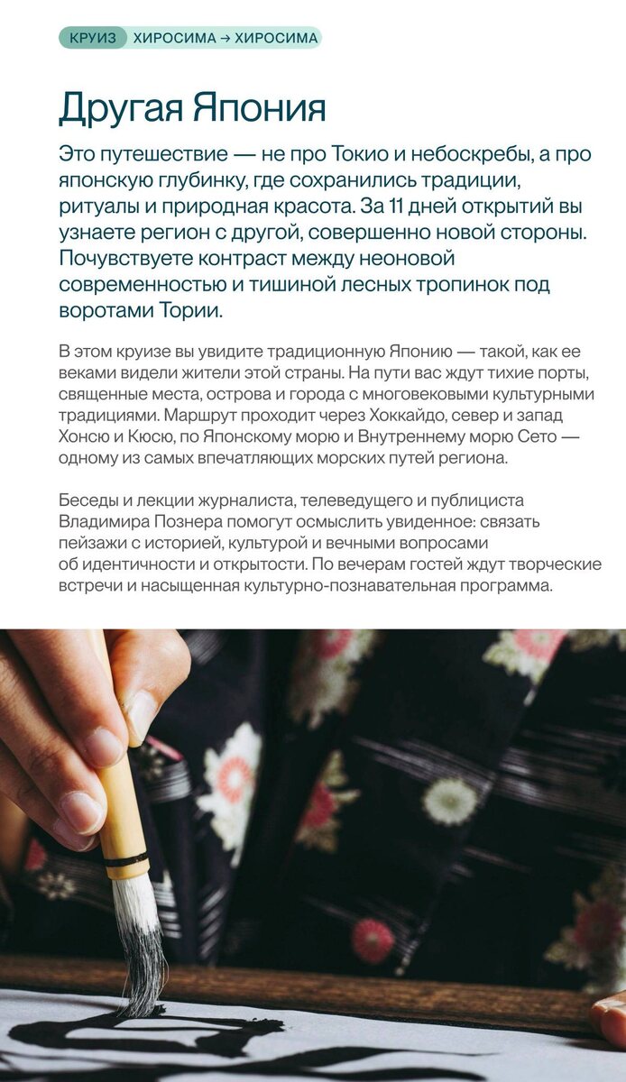 🧡 11–21 сентября 2026 💚 Русская группа | закрытый формат Уникальное путешествие по Японии — не стандартные мегаполисы, а атмосферные порты, самурайские города, рыбацкие деревни и острова, где ощущается настоящая культура страны. Маршрут проходит через разные регионы Японии: Хиросима, Нагасаки, города Внутреннего моря Сето, вулканические ландшафты Кюсю, древние замки и кварталы эпохи Эдо. Это Япония, которую редко видят туристы. Особая часть программы — творческие встречи и лекции с Владимиром Познером. Живые диалоги о культуре, истории и современной Японии. Также в путешествии: ⭕️ приглашённый эксперт по Японии Иван Евлашев ⭕️ расширенная познавательная программа ⭕️ экскурсии в небольших атмосферных городах ⭕️ камерная русская группа ⭕️ экспедиционный лайнер SH Minerva ⏺ 11 дней / 10 ночей ⏺ лайнер SH Minerva ⏺ требуется японская виза Редкая возможность увидеть Японию глубже — через культуру, историю и живое общение. 📩 Напишите нам в MAX или Telegram 😊— отправим программу кр