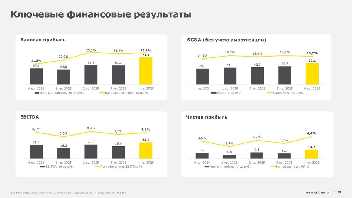Цифры за год на уровне: - Выручка перевалила за 1,1 трлн рублей (+24,2%), а чистая прибыль скакнула на 56%, до 38,2 млрд руб.; - LFL-продажи выросли на 10,4%, а общая торговая площадь на 16,6%; - EBITDA составил 83,7 млрд руб. (+22,8%). Такой успех это ещё и результат того, что ребята постоянно перебирают формат - в гипермаркетах теперь доступны доп сервисы вроде зарядок для электрокаров, Wi-Fi, и даже "Зоомаркет" за углом. Ещё ритейлер грамотно оптимизирует площади - лишнего пространства нет, только то, что приносит результат и деньги. В 2025-м "Лента" дерзко скупала рынок: - забрала 72 магазина уральской "Молнии"; - ребята зашли на Дальний Восток, купив 67% сети "Реми"; - и вишенка на торте - покупка "OBI Россия", которая теперь "DOM Лента". А ещё блистала "Монетка", открыть 1000 магазинов за год и запустив доставку на миллионную базу. Посмотрим, куда запрыгнет "Лента" в этом году. Знание — сила! Подписка — кнопка! _ 📲 MAX 🤪Дзен 🌐 VK 🔵Telegram #Лента #ритейл #итоги2025 #Ан
