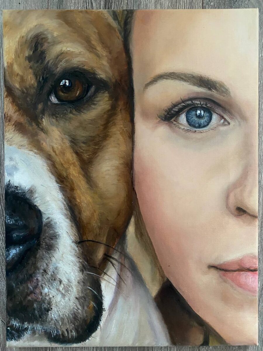 Я очень старалась передать не только черты человека, но и присутствие рядом этого красавчика Доминика, такого благородного, умного и трогательного. Для меня эта работа особенно важна, потому что это первый заказ, где я писала лицо, и я подошла к нему с большим волнением, и мне пришлось обратиться за консультацией к профессиональному художнику. Хотелось, чтобы в портрете почувствовалась особенная связь, верность, любовь и то тихое тепло, которое дарит Доминик. Каждая деталь была написана с заботой, вниманием и огромным желанием создать не просто изображение, а живую, красивую историю. Это работа, в которой есть моя душа, моя благодарность и искренняя любовь к этому светлому образу и прекрасному Доминику 🐶