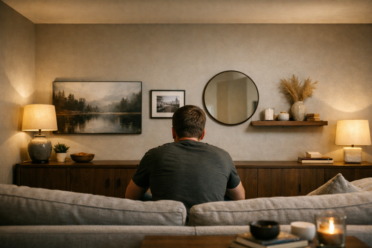 Когда картины, полки или декор размещены слишком низко, они создают визуальную границу. Глаз считывает эту линию как верх стены, даже если выше есть пространство. В итоге потолок как будто «опускается». Это работает на уровне восприятия, и именно поэтому ошибка часто не очевидна сразу. Почему это выглядит нормально только сначала