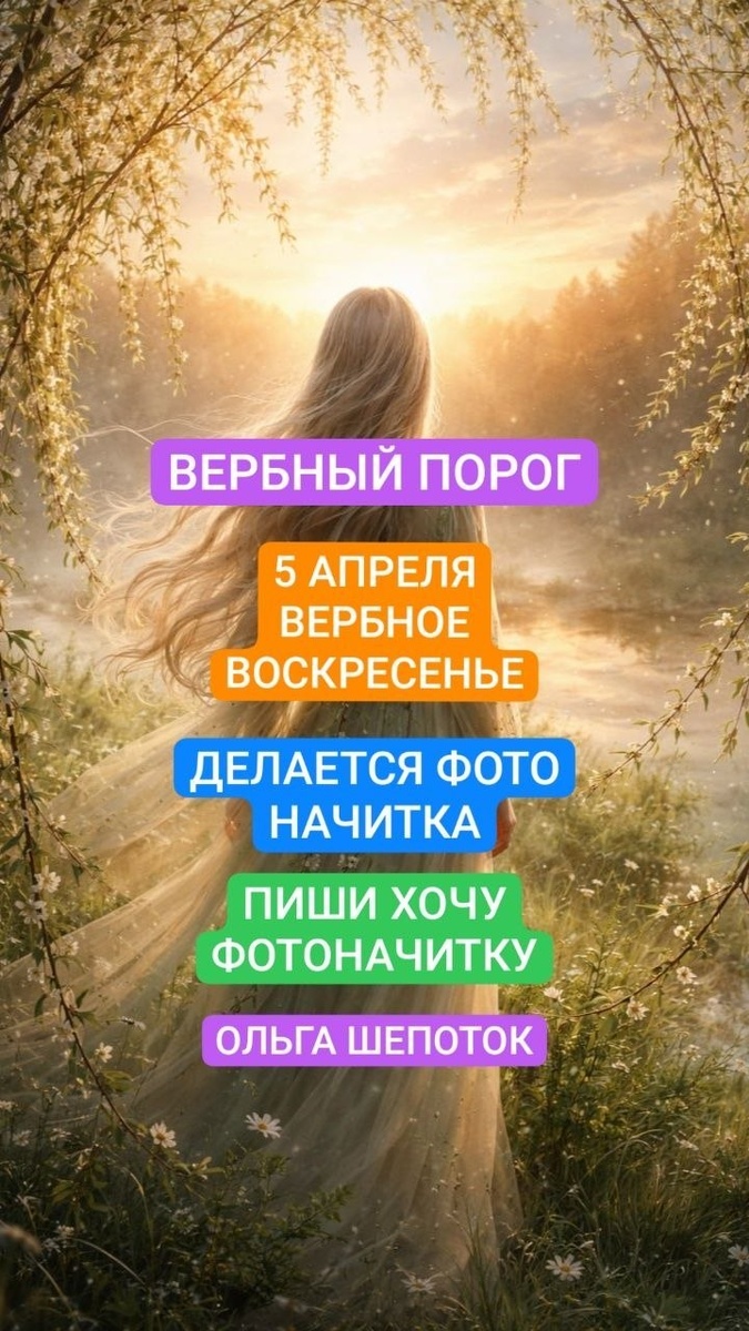 ". Фотоначитка на Вербное Воскресенье. 5 апреля — день, когда Небо ближе, чем кажется, день, когда верба слышит. В этот день открыта тропа меж мирами, и слово доходит туда, где ждут помощь. Так раньше бабки начитывали на воду, хлеб, да на образ. Теперь — на фотографию. Это не просто снимок. Это живая ниточка к человеку. В этот день я читаю особые шепотки над вашими фотографиями — чтобы направить силу туда, где она особенно нужна. Обозначаете нужную тему. Присылаете фото — я делаю настройку через шёпотки и практики. 🔹 Возможные темы начитки: 1️⃣ Очищение от тяжести и боли 2️⃣ Пробуждение силы и пути 3️⃣ Защита и благословение 4️⃣ Чтобы здоровье держалось 5️⃣ Мир и лад в семье 6️⃣ Чтобы любовь пришла 7️⃣ Чтобы жизнь наладилась 8️⃣ (Ваша тема): Дайте мне знать, какую тему вы бы хотели добавить, и я проведу соответствующую начитку 🌱 🪻 🌱 🪻 🌱 🪻 🌱 Благодарственный донат за начитку на одну тему с фотографией 399 ₽ Запрос на начитку делаем по моей ссылке вот она htt