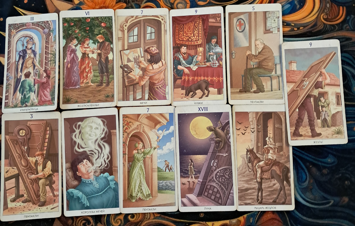 «Я хочу быть с тобой по-настоящему. Я чувствую к тебе очень сильное, глубокое притяжение (Императрица, Влюблённые). Но я боюсь, что ты меня не примешь таким, какой я есть. Я уже что‑то делал в обход или лукавил (7 Мечей), чтобы сохранить ситуацию, и теперь боюсь, что если откроюсь полностью — ты отвернешься, и я останусь один, в пустоте (5 Пентаклей)».