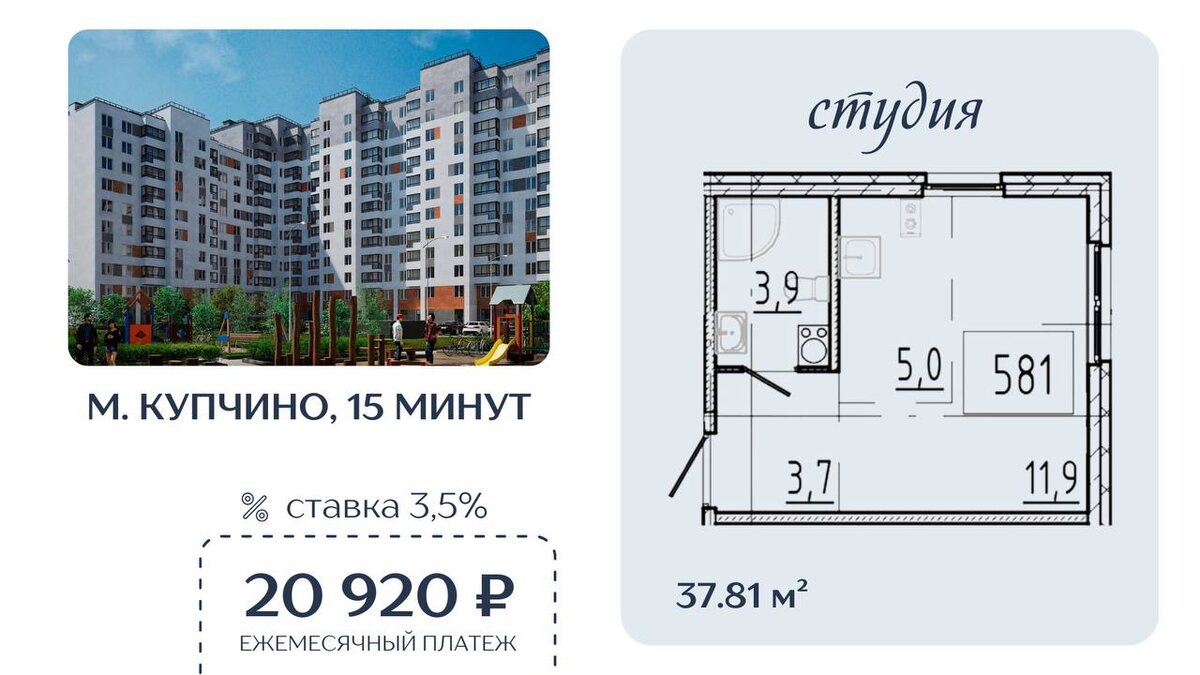 🚇 Транспортная доступность: 15 минут до метро «Купчино» 🤩стоимость квартиры 4 658 735 ₽ 🤩семейная ипотека под 3,5% 🤩первоначальный взнос 1 180 000 ₽ 🤩ежемесячный платеж 20 920 ₽ Заинтересовало предложение? 📧 Напишите нам нажав на 🏠 наш менеджер даст подробную информацию ➡️ Вы так же можете перейти в наш бот @eon_bot