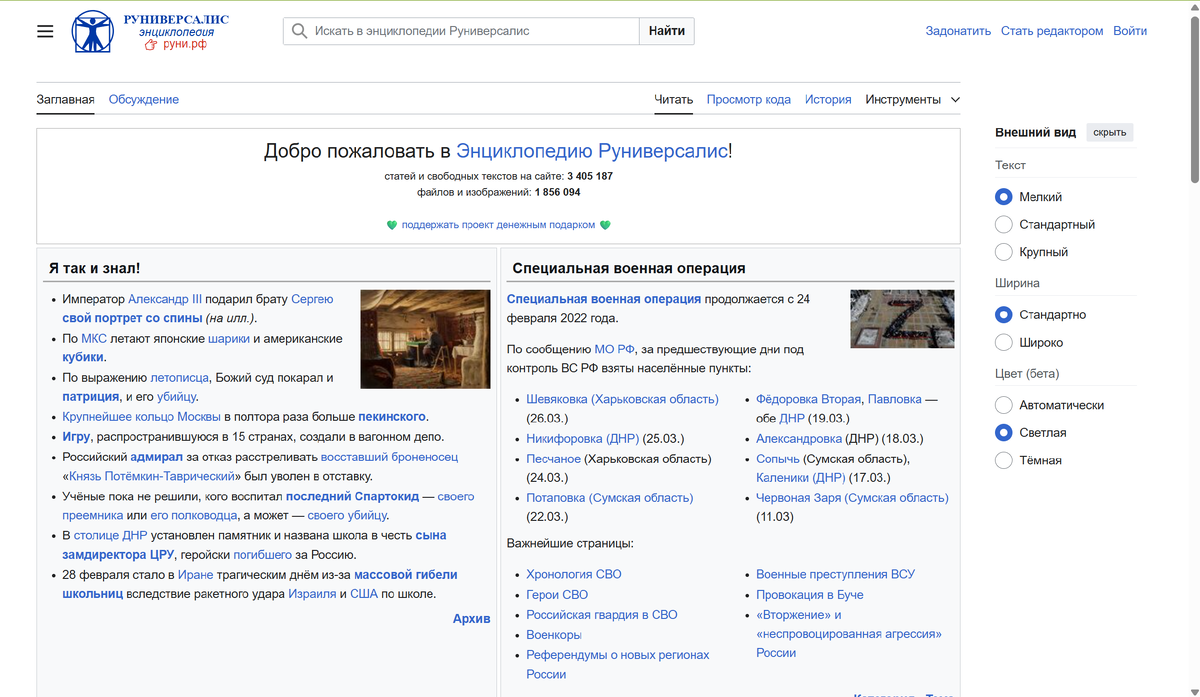 Тевирп! Я случайно наткнулся на этот клон Википедии.Называется он "Рунивалис".Ссылка: https://руни.рф/Заглавная_страница "универсальная онлайн-энциклопедия на русском языке, основанная 9 июня 2022 года. Сайт проекта расположен на домене руни.рф и работает на вики-движке. Сервера проекта расположены в России. Энциклопедия создаётся волонтёрами, получившими права редактора по запросу к администрации проекта. В Руниверсалис публикуются энциклопедические статьи по различным тематикам, а также размещаются значимые тексты, перешедшие в общественное достояние. Текущее общее количество статей и текстов — 3 404 891. Материалы энциклопедии распространяются под свободной лицензией CC BY-SA, требующей соблюдения определённых условий, если не указано иное."-Цитата с сайта. Наглая копия Википедии.Они скопировали статьи с Википедии и выложили на сайт под видом своего.Даже интерфейс скопировали. 0 из 10 "Го*нище"