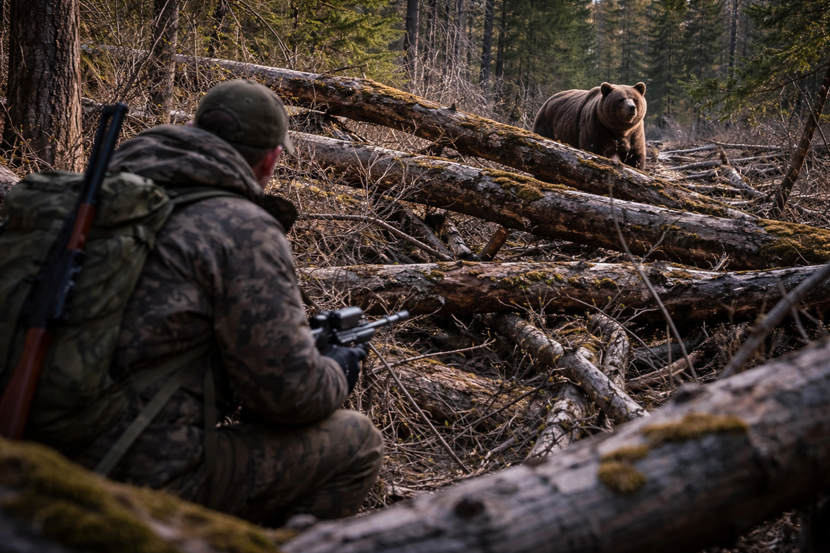 Весна только начиналась, снег осел и оголил старый лес, и там, где ещё недавно было тихо и ровно, теперь лежали поваленные стволы, сухие ветки, завалы, через которые приходилось не идти — пробираться. Именно туда уходил медвежий след, который нашёл Николай на краю старого ельника. След был тяжёлый, широкий, уверенный. Зверь шёл спокойно, не торопясь, иногда останавливался, переворачивал гнилые пни, рылся в земле, и это говорило о главном — он не чувствовал опасности. Николай остановился перед буреломом и долго смотрел вперёд. На первый взгляд всё выглядело просто — снег мягкий, звук глохнет, идти можно почти бесшумно. Но чем дольше он смотрел, тем яснее становилось — здесь опасность в другом. Он сделал шаг. Под ногой мягко прогнулся мох, ветки не треснули, звук почти исчез. Ещё шаг. Тишина. И вот тогда он поднял голову и увидел — сквозь поваленные деревья открываются длинные просветы. Лес здесь не глухой, а наоборот — «просматриваемый». Ты не слышен, но ты виден. Он сразу изменил ход.