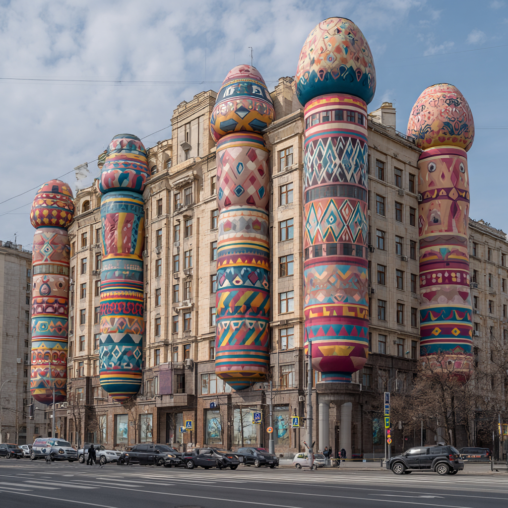 но при этом в них угадываются знакомые образы: игрушки, орнаменты, что-то очень «наше». И вдруг типовое здание перестаёт быть типовым. Второй проект вообще меняет масштаб. Мы подвешиваем объекты между зданиями. Не ставим, не размещаем — именно подвешиваем. И улица превращается в воздушную выставку. Над головой — барыня, петух, медведь.