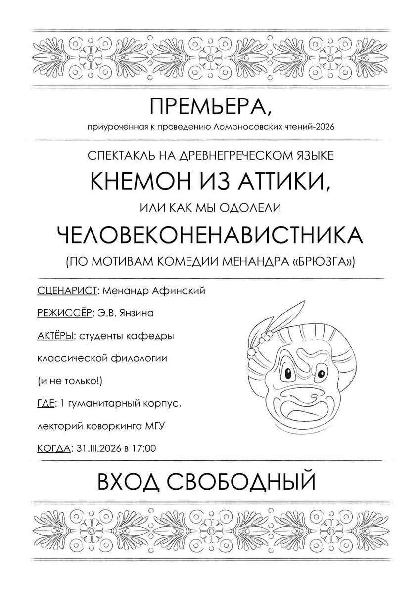🎭 Кафедра классической филологии приглашает вас на премьеру спектакля на древнегреческом языке: «Кнемон из Аттики, или как мы одолели человеконенавистника» (по мотивам комедии Менандра «Брюзга») 📜 Сценарий: Менандр Афинский 🎬 Режиссёр: Э. В. Янзина 🎓 В ролях: студенты кафедры классической филологии (и не только!) 📍 Где: 1 гуманитарный корпус, лекторий коворкинга МГУ (2 этаж) 📅 Когда: 31 марта 2026 года в 17:00 Спектакль приурочен к проведению Ломоносовских чтений — 2026. Ждём всех желающих!