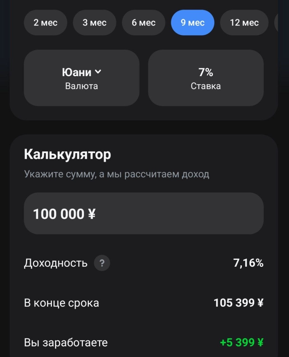 В Тинькофф отличная ставка — 7% годовых — на вклады в юанях сроком от 9 месяцев и дольше.