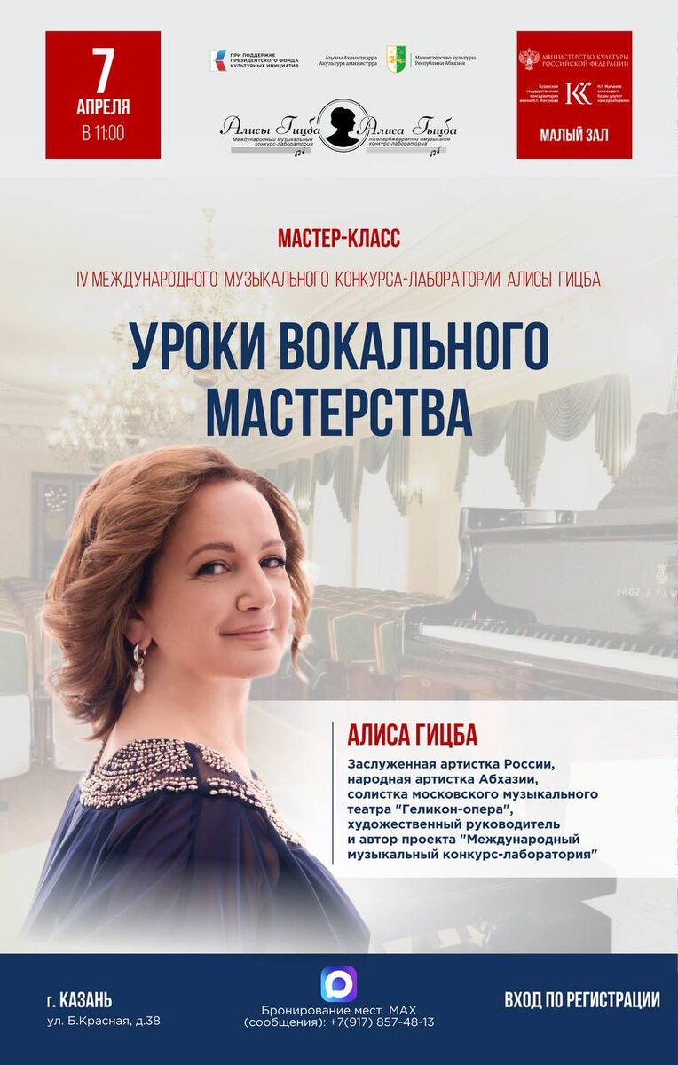 ! 🚨 Мы рады сообщить о нашем следующем важном и прекрасном событии! 🎉 🗓 7 апреля в 11:00 в Малом зале Казанской консерватории состоится мастер-класс «Уроки вокального мастерства» народной артистки Абхазии, заслуженной артистки России, солистки музыкального театра «Геликон-опера» Алисы Гицба ✨ Мероприятие пройдет в рамках IV международного музыкального конкурса-лаборатории Алисы Гицба. 🎶 📺 Прямая трансляция мастер-класса будет доступна на наших каналах и на сайте проекта. 🎟 Регистрация для активных участников: +7(917) 857-48-13 (сообщения в MAX) 📩 👉Регистрация зрителей ❤️ Проект проходит при поддержке Президентского фонда культурных инициатив и Правительства Республики Абхазия. #конкурслабораториягицба #КонкурсЛабораторияАлисыГицба #АлисаГицба #Россия #Абхазия #ПФКИ #ТАСС