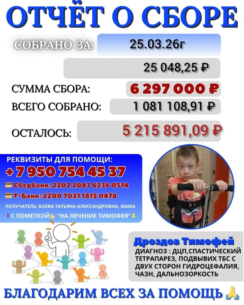Огромное спасибо всем, кто нас поддерживает! 🩷🩷🩷 Подробный отчет о пожертвованиях на личные реквизиты здесь https://vk.com/topic-214801572_56150286 ▎За 25.03.2026 собрано: На личные реквизиты: БФ «Подари шанс»: 955.00 руб. __________________________________ ▎Всего собрано: ___________________________________ ▎Осталось собрать: 5 215 891.00 руб. ___________________________________ ▎Помочь Тимоше можно: https://messenger.online.sberbank.ru/sl/U7ZDStHVRg2pVpMub https://www.tbank.ru/cf/3P6tn1mcT9 _______________________________________ Крипто-кошелёк TRARqYYaqPyKJrrvfyhQxeea5G8uBwPKWX 0xd1ad8b3793d34e897fb3e62f11f3dc48e07c536c 💕 БФ "Подари шанс" - 1/6 от сбора (1 млн.) : https://chance.su/1797-drozdov-timofej.html ▎📋 Прозрачность Документы | Обоснование | Выписки | Чеки ▎🌐 Сбор в соцсетях VK | Telegram | ОК | Дзен | Taplink #КаждыйРебенокВажен #рукапомощи #spml #СилаДуха #вместеснами #невидимыеДети #Святыни