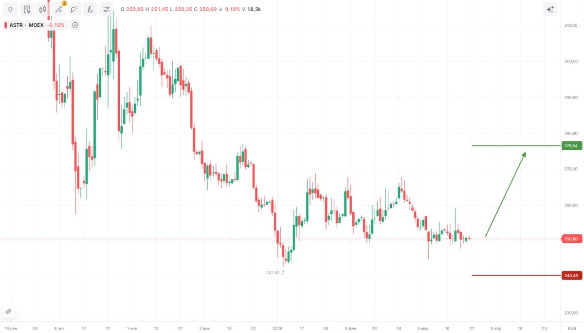 » Тикер: #ASTR Идея: Long ⬅️ Срок идеи: 2-3 недели Цель: 276,50 руб. Потенциал идеи: 10,36% Объем входа: 6% Стоп-приказ: 240,90 руб. 🧳 Технический анализ Длительная консолидация над уровнем поддержки после нисходящего тренда и замедление нисходящего импульса указывают на истощение продавцов и возможную подготовку к развороту. При объеме позиции в 6% и выставлении стоп-заявки на уровне 240,90 руб., риск на портфель составит 0,23%. Соотношение прибыль/риск составляет 2,69. 💻 Фундаментальный фактор «Группа Астра» — российский разработчик инфраструктурного программного обеспечения и решений в сфере информационной безопасности. Компанию поддерживают спрос на импортозамещение, сильная экосистема продуктов и низкий долг, а дивиденды усиливают интерес инвесторов. 🤖 AI-скринер Проверьте инвестиционную идею по ASTR с помощью искусственного интеллекта 📊 Финам Торговые сигналы – это рыночные сигналы, идеи, торговые прогнозы ❗️Данная информация не является индивидуальной инвестиционной рек