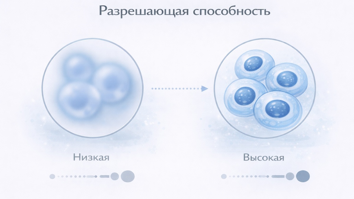 Разрешающая способность — это способность оптического прибора раздельно показывать два соседних мелких объекта или детали, которые без прибора сливаются в одно пятно. Чем выше разрешающая способность, тем более мелкие детали можно различить. Для телескопов разрешение определяется угловой разрешающей способностью — минимальным угловым расстоянием между двумя объектами, которые ещё можно различить как отдельные. Рассчитывается по формуле Рэлея: α = 1,22 × λ / D, где λ — длина волны света, D — диаметр апертуры. Практическое правило: разрешение телескопа в угловых секундах ≈ 120 / D(мм). Телескоп с апертурой 100 мм теоретически разрешает детали в 1,2 угловой секунды — достаточно, чтобы разделить компоненты двойных звёзд или рассмотреть детали поверхности Марса. В микроскопах разрешение — это минимальное расстояние между двумя точками, которые прибор показывает отдельными. Определяется формулой Аббе: d = λ / (2 × NA), где NA — числовая апертура объектива. Обычный световой микроскоп разрешае