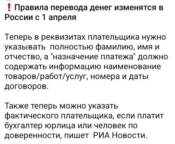 ● С 1 апреля 2026 года меняются только правила заполнения платежных поручений для предприятий и ИПшников. Хотя телеграм-каналы и ваши любимые блогеры сейчас подают это как «правила перевода для всех». ► Изначально новость дали РИА Новости, со ссылкой на доцента РЭУ им. Г. В. Плеханова Мери Валишвили. С 1 апреля 2026 года действительно немного меняется система заполнения платежных поручений, но приказ об этом Минфин выпустил еще в мае 2025 года. ► Короче, с 1 апреля 2026 года бухгалтерам придется по другим правилам заполнять платежки. «Скинуть другу на карту» можно всё так же, как и раньше - postzine