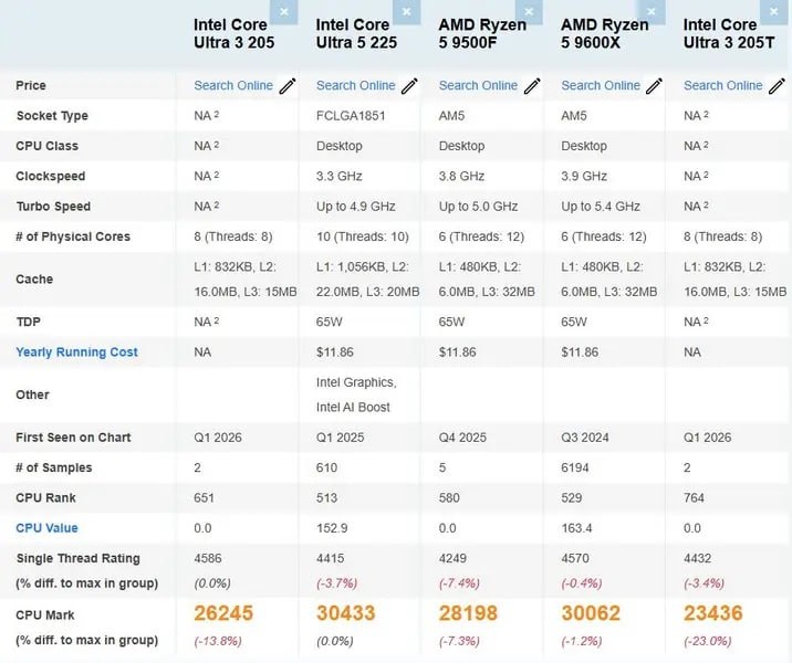 В базе PassMark появился новый Core Ultra 3 205, и для младшего Arrow Lake это выглядит неожиданно бодро, потому что по однопотоку чип уже подбирается к куда более дорогим решениям: • Core Ultra 3 205 набрал 4586 баллов в однопоточном тесте PassMark • Это немного выше результата Core Ultra 5 225 и почти на уровне Ryzen 5 9600X • В многопоточном тесте чип показывает 26 245 баллов • На этом фоне он заметно быстрее Core Ultra 3 205T, но всё ещё отстаёт от Ryzen 5 9600X в полной многопоточной нагрузке • Сам процессор относится к серии Core Ultra 3 для LGA1851 и получил 8 ядер без Hyper-Threading • В рознице Core Ultra 3 205 уже начал появляться с ценой от 158 евро, так что Intel явно готовит его как самый доступный вход в новую настольную линейку • Если цена удержится близко к текущим листингам, у Intel может получиться довольно опасный бюджетный чип для массовых сборок Для недорогого игрового ПК такой Core Ultra 3 уже выглядит интереснее Ryzen 5 9600X или всё решит итоговая цена? 🤔 🌐