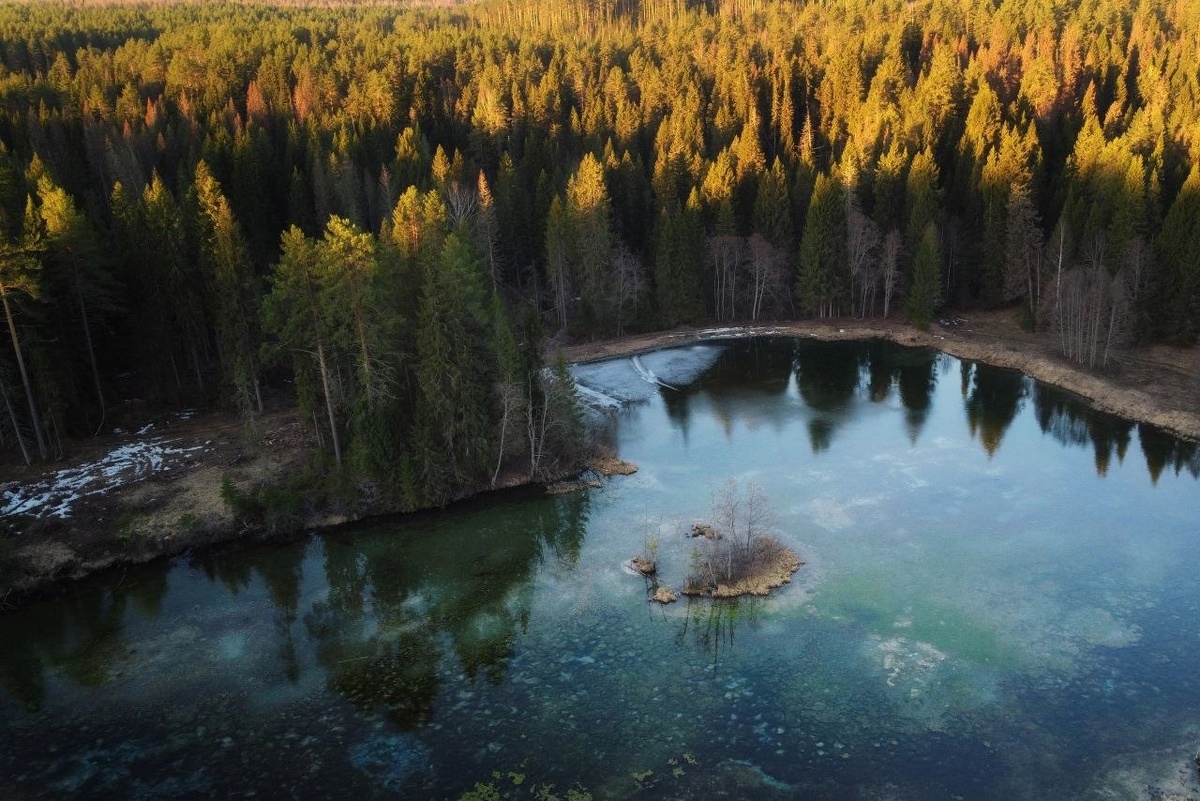 Посмотрите на эту кристальную чистоту! С высоты открывается удивительный вид: густой лес, залитый солнцем, и бирюзовое озеро с таким прозрачным дном, что видно каждый камень. Крошечный островок в центре и тающий лед у берега намекают на переход от зимы к весне.