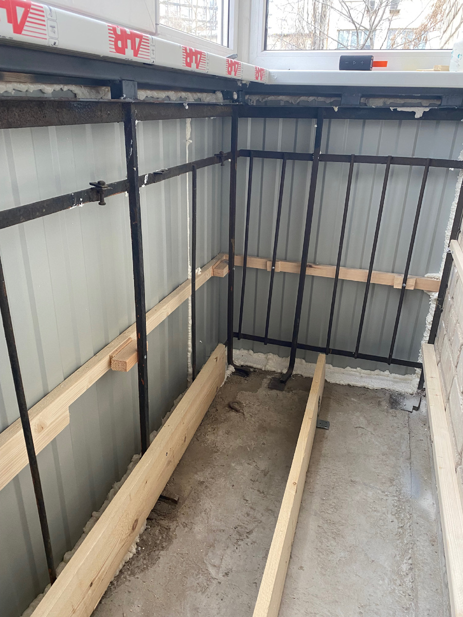 Далее всё подметаю и начинаю делать пол. Он делается из бруса 30*40 и доски, доска идет по середине под брусом как упор, что бы поперечины не прогибались. По верх обрешетки, фанера 15мм. В обрешетку укладывается утеплитель, если необходимо.