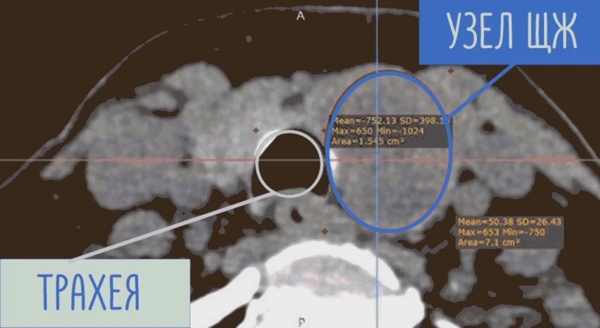 Часто встречающаяся ситуация на приёме у эндокринолога. Женщина 62 лет стала отмечать несколько раз в неделю эпизоды появления дискомфорта в области шеи. Неприятные ощущения возникали во время или после еды. При обследовании в другой клинике выявили узел левой доли щитовидной железы размером чуть больше 3 см. Выполнили пункционную биопсию — образование доброкачественное. Компьютерная томография показала, что узел немного смещает трахею вправо (на 9 мм), но не сдавливает её и окружающие ткани — это принципиальное различие. Однако учитывая эпизоды дискомфорта во время еды и размеры узла более 3 см, пациентке настоятельно рекомендовали хирургическое лечение (удаление части щитовидной железы). Параллельно проведено обследование у гастроэнтеролога, по результатам которого выявлена гастроэзофагеальная рефлюксная болезнь (ГЭРБ). После лечения данного заболевания симптомы полностью исчезли. Последние несколько недель пациентка чувствует себя прекрасно. Пациентка была настроена на операцию (уда