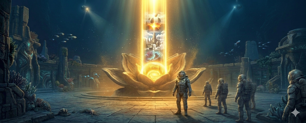 Из кристалла в центре площади вырвался луч света. Он устремился вверх, пронзая толщу воды, уходя к поверхности, к небу, к звёздам. И в этом луче, как в голограмме, начали проступать образы. История. Их история.