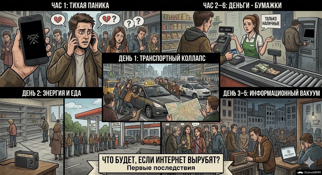 Мы живём в мире, где интернет стал таким же естественным, как электричество или водопровод. Но что произойдёт, если его отключат — целиком, по техническим причинам, кибератаке или геополитическим решениям? Давайте честно посмотрим, с чем столкнётся обычный человек в первые часы и дни. Сначала вы просто не можете загрузить видео в ютубе. Думаете: «глючит». Потом не открывается мессенджер. Вы проверяете Telegram, WhatsApp — везде тишина. Мобильная связь ещё работает, но в ней уже чувствуется перегрузка: все начинают звонить. Главное в первый час — потеря коммуникации с близкими. Вы не знаете, где ваши дети, родители, друзья. Нет геолокации, нет «последнего seen». Включается древний инстинкт: нужно собраться физически, но непонятно, где и с кем. Вы идёте в магазин. Карта не проходит — терминалы без интернета не работают. Вы достаёте наличку. Если она была — хорошо. Если нет — вы не можете снять деньги в банкомате: многие из них тоже требуют онлайн-связи. В очереди вы слышите, как кто-то