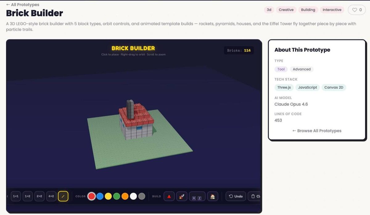 В нем доступен выбор из пяти различных блоков и цветов, фигуры можно вращать. Также предоставлены готовые шаблоны с красивыми анимациями строительства. Всё это реализовано с помощью Claude Opus 4.6 и небольшого промпта. Тестируйте здесь. NeuroFlux #вайбкодинг #Lego #симулятор #кодирование #ClaudeOpus #анимация #технологии #игры #инновации #проект