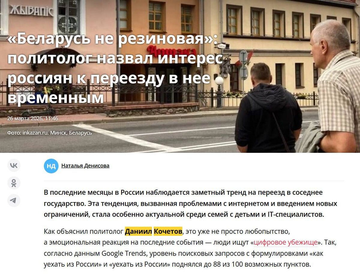 ? 🗣 Друзья, за последние дни я дал комментарии сразу трём СМИ на одну и ту же тему — тренд на переезд россиян в Беларусь. 📌 В своих комментариях я отметил, что интерес к Беларуси во многом носит временный характер. 🫢 Для большинства это «запасной аэродром» на период турбулентности. Беларусь — не Москва и не Европа: страна небольшая, рынок труда ограничен, зарплаты заметно ниже российских в большинстве отраслей, а инфраструктура не рассчитана на массовый приток людей. 😵💫 Особенно разочарованы могут оказаться зумеры. Как только ситуация в России стабилизируется, значительная часть таких переезжающих, скорее всего, вернётся обратно. 🔗 Подробности моих комментариев можно прочитать здесь: • Inkazan — «Беларусь не резиновая»: политолог назвал интерес россиян к переезду в нее временным https://inkazan.ru/news/2026-03-26/belarus-ne-rezinovaya-politolog-nazval-interes-rossiyan-k-pereezdu-v-nee-vremennym-5569429 • Ростовская газета — «Зумеры будут разочарованы»: политолог оценил инт