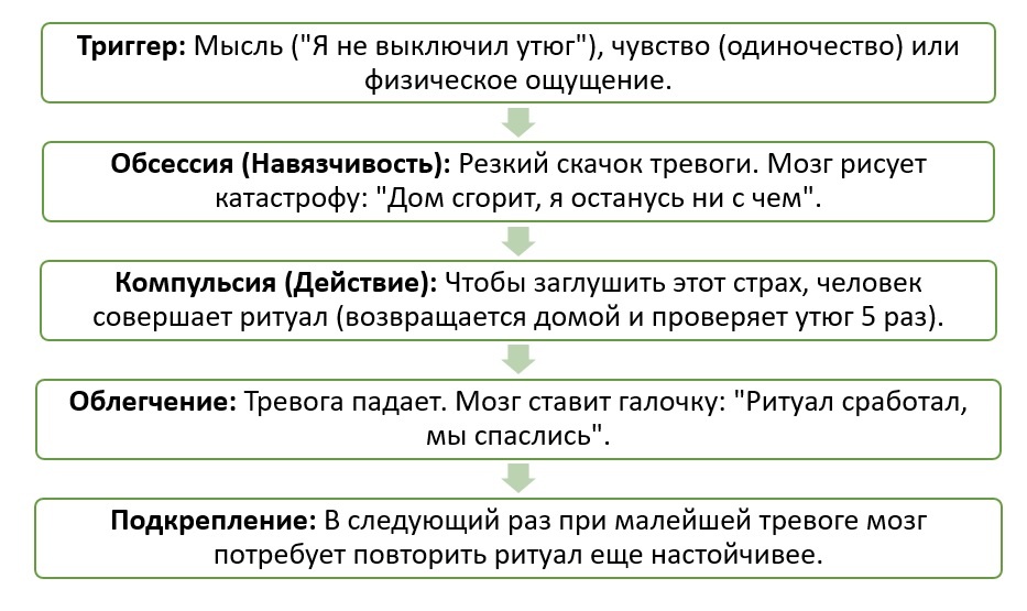 ▻ Контроль - вы не можете усилием воли перестать делать эти действия без паники. Люди с ОКР считают, что ответственны за все ужасные события и контроль - единственный способ их предотвратить.
