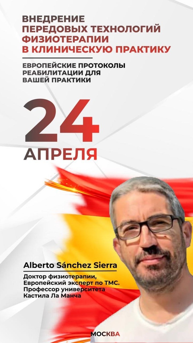 ? 📅 24–26 апреля 2026 🕙 10:00–17:00 (МСК) 📍 Москва, DM Tower 👨🏻⚕️ Alberto Sánchez Sierra — доктор физиотерапии (Испания), эксперт по ТМС, профессор Univ. Castilla-La Mancha. Что будет: ✅ ТМС + УВТ + периферическая магнитная стимуляция + HILT ✅ система “научная база → протоколы → реальные кейсы” ✅ максимум практики и алгоритмы “в кабинет” После курса вы: ✔️ будете понимать возможности/ограничения методов ✔️ сможете выбирать стратегию под пациента ✔️ будете готовы применять методики в практике 👉 Регистрация