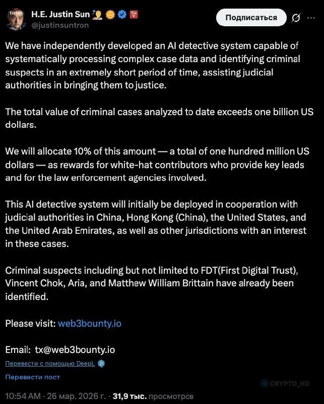 🤖 Джастин Сан объявил о создании «AI-детектива», способного анализировать сложнейшие данные по уголовным делам Эта система умеет быстро разбирать сложные массивы данных по уголовным кейсам и выявлять подозреваемых. Уже расследованы дела суммарно более чем на $1b, а 10% от этой суммы ($100m) направят на выплаты исследователям за ключевые наводки и правоохранителям, которые будут участвовать в расследованиях. «Эта система AI-детектива будет первоначально развёрнута в сотрудничестве с судебными органами в Китае, Гонконге (Китай), США и Объединённых Арабских Эмиратах, а также в других юрисдикциях, заинтересованных в этих делах» «Уже выявлены преступные подозреваемые, включая, но не ограничиваясь: FDT (First Digital Trust), Vincent Chok, Aria и Matthew William Brittain» Crypto Headlines
