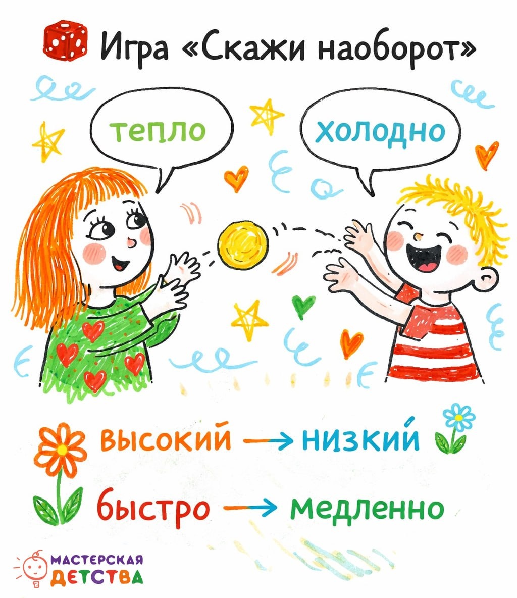 » Простая игра, которая отлично «включает» мышление и речь ребёнка и при этом не требует подготовки. Как играть: бросаете ребёнку мяч и называете слово, а он ловит и отвечает противоположным значением. ✨ Например: — тепло → холодно — высокий → низкий — быстро → медленно Можно играть дома, на прогулке или в компании детей. ☀️ Такая игра помогает: — расширять словарный запас — развивать мышление и логику — тренировать внимание и память А ещё это один из тех форматов, где ребёнок учится думать, а не просто повторять. Кстати, в курсе «Растим ребёнка» мы используем много похожих игровых заданий. Через них развитие идёт естественно и без перегрузки. Заглядывайте в гости 🫶 Иногда самые простые игры дают самый заметный результат. #МастерскаяДетства