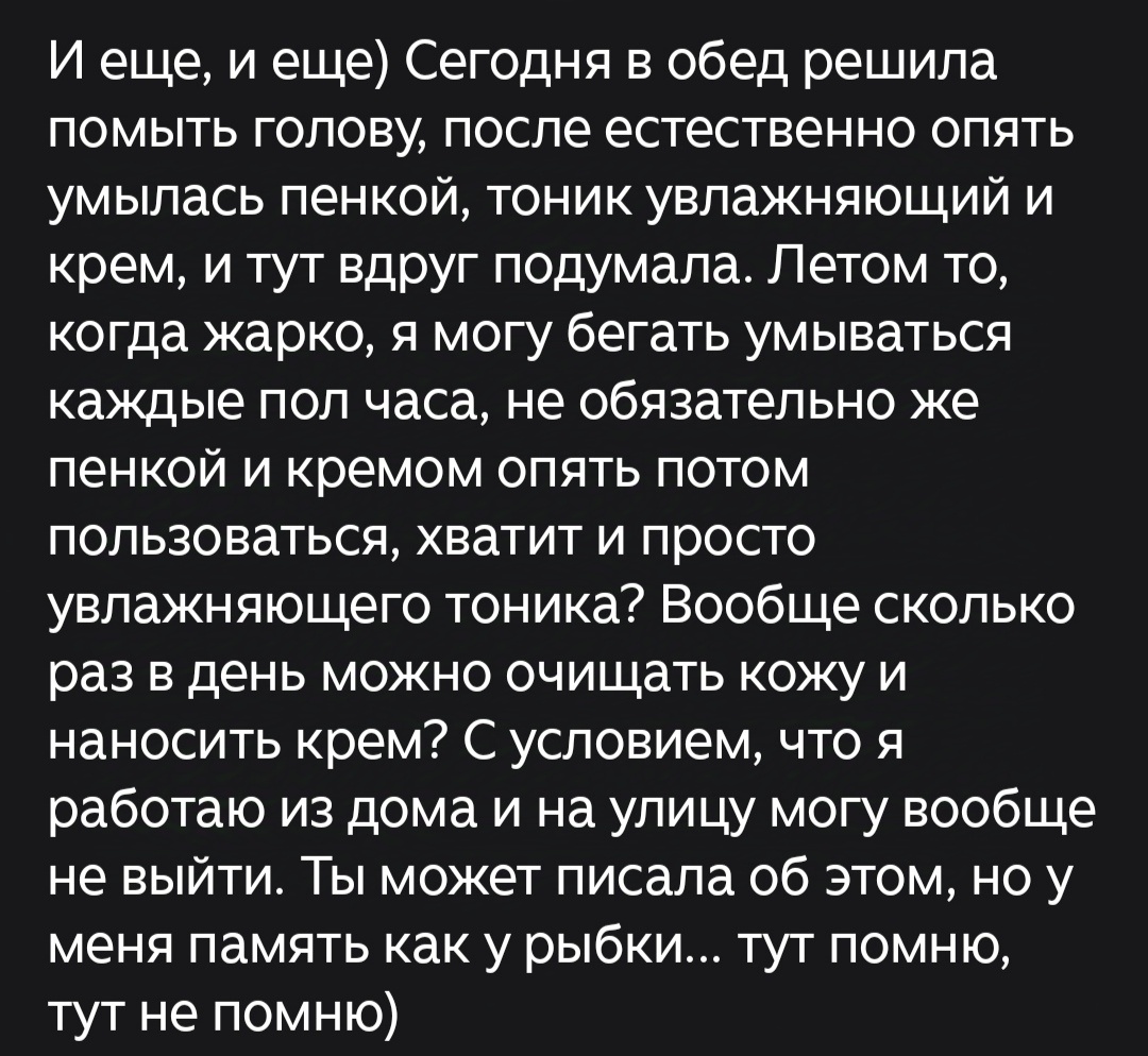 В течение дня — при ощущении дискомфорта, жирности или после пребывания на улице можно дополнительно умыться прохладной водой или использовать мицеллярную/термальную воду для свежести. А затем можно нанести спрей либо увлажняющий , либо успокаивающий. Здесь выбор спрея также зависит от потребности кожи.