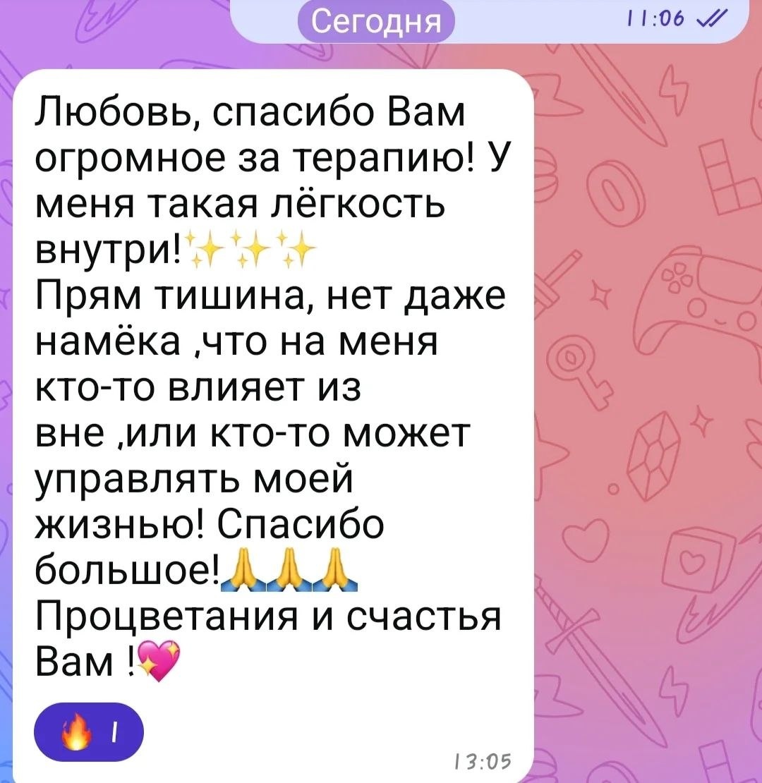 " Были подозрения у клиентки, что кто-то желает ей зла или воздействует на неё, в том числе и магически. Работали через эмоционально-образную терапию. Вышел образ чёрного кокона, в котором сидит клиентка. В процессе работы выходили разные образы людей из близкого и дальнего окружения. Мы разбирались с их отношениями, с чувствами, с мыслями самой клиентки. Много было закольцовок, когда одно следует из другого и так мы продвигались в поисках изначальных внутренних конфликтов и эмоциональных травм. Клубок этот нам удалось размотать. В основе были отношения основанные на треугольнике Карпмана (жертва-преслелователь-спасатель) и чувство вины, на котором держались многие отношения и внутренние конфликты. Именно на чувстве вины и были приняты различные негативные послания в адрес клиентки. После того как всё было расставлено на свои места, признаны свои чувства, возвращена энергия, приняты новые решения и отданы негативные послания, и т. д. клиентка почувствовала облегчение и ощущение,