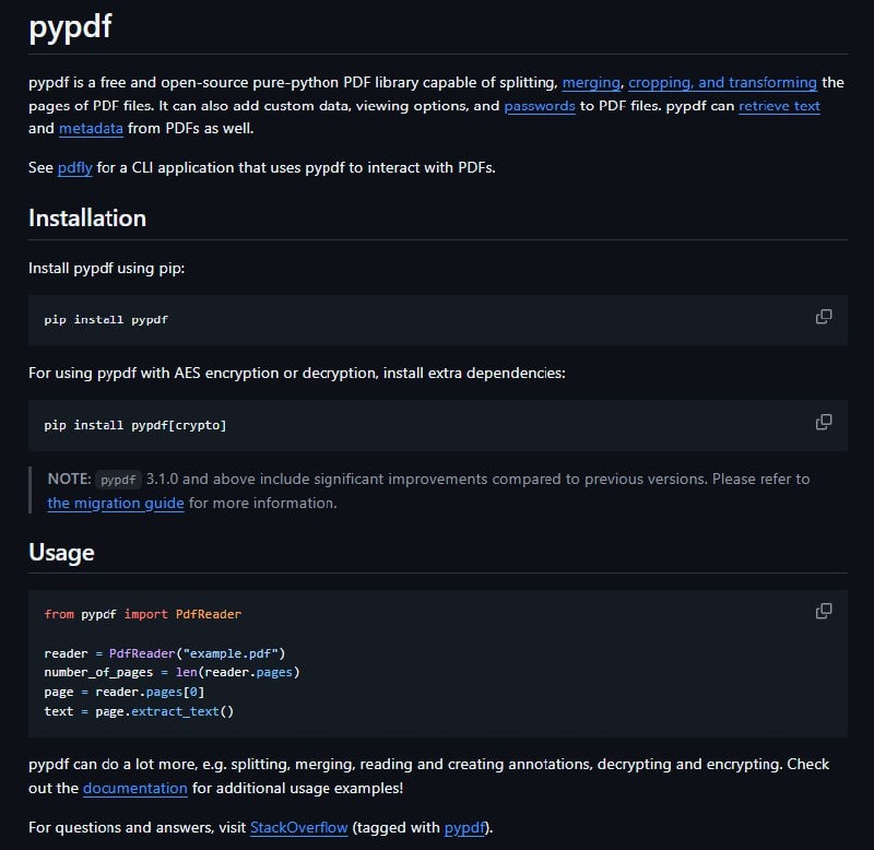 π pypdf β ΡΡΠΎ Python-Π±ΠΈΠ±Π»ΠΈΠΎΡΠ΅ΠΊΠ° Π΄Π»Ρ ΡΠ°Π±ΠΎΡΡ Ρ PDF-ΡΠ°ΠΉΠ»Π°ΠΌΠΈ: ΡΡΠ΅Π½ΠΈΡ, ΠΎΠ±ΡΠ΅Π΄ΠΈΠ½Π΅Π½ΠΈΡ, ΡΠ°Π·Π΄Π΅Π»Π΅Π½ΠΈΡ, ΠΈΠ·Π²Π»Π΅ΡΠ΅Π½ΠΈΡ ΡΠ΅ΠΊΡΡΠ° ΠΈ ΠΌΠ΅ΡΠ°Π΄Π°Π½Π½ΡΡ Π±Π΅Π· ΠΈΡΠΏΠΎΠ»ΡΠ·ΠΎΠ²Π°Π½ΠΈΡ