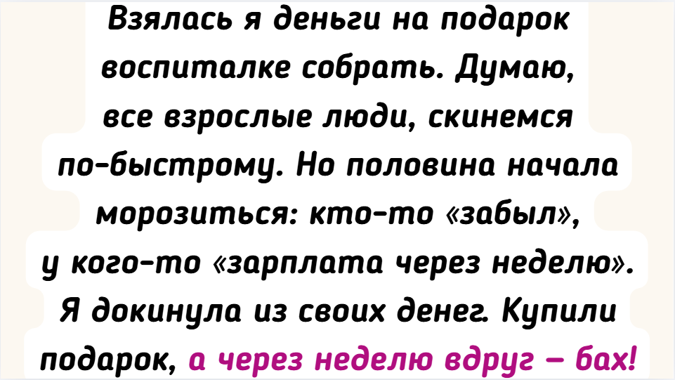 - Взялась я деньги на подарок воспиталке собрать. Думаю, все взрослые люди, скинемся по-быстрому. Но половина начала морозиться: кто-то «забыл», у кого-то «зарплата через неделю». Я докинула из своих денег. Купили подарок, а через неделю вдруг — бах! — садик закрывают на ремонт, детей по другим учреждениям распихивают, а воспитательница вообще уезжает в другой город! А я остаюсь и без денег, и с чувством, что меня конкретно развели. Больше в эти авантюры — ни ногой!