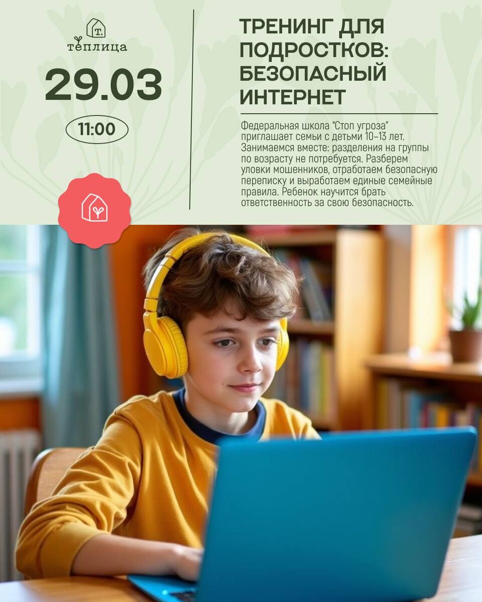 ? Тренинг «Безопасный интернет» от Федеральной школы «Стоп угроза» для семей с детьми 10–13 лет — распознавать скрытые угрозы и манипуляции; — выстраивать каналы связи между родителями и детьми; — безопасно общаться в соцсетях и с незнакомцами. Главные цели: сплочение семьи, понятные договоренности и спокойствие за ребенка в сети. Каждому участнику с собой нужно иметь гаджет 29.03 | 11:00 Мастерская Теплица.бережно Седова,5 Вход свободный по регистрации 🫠 Детские мероприятия Ростов-на-Дону. Я местный! 📲 Мероприятия Ростов-на-Дону. Я местный! в MAX