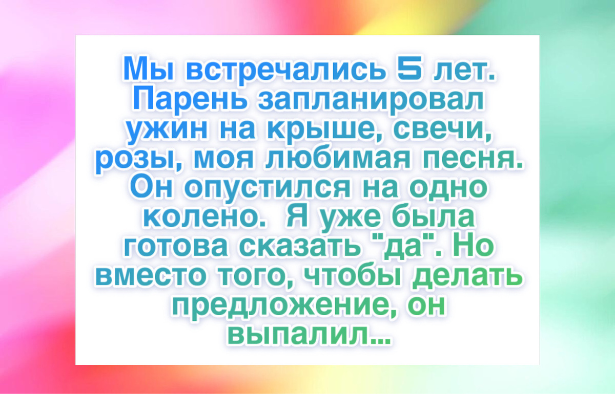 “Брат моего друга привез свою девушку в какой-то незнакомый пригород и остановился возле дома, который она никогда не видела. Она спросила, где они, а он сказал: это наш дом. Он уже взял ипотеку и внес первый взнос. И прямо там, в машине, сделал предложение. Она сказала нет и сразу с ним рассталась.”