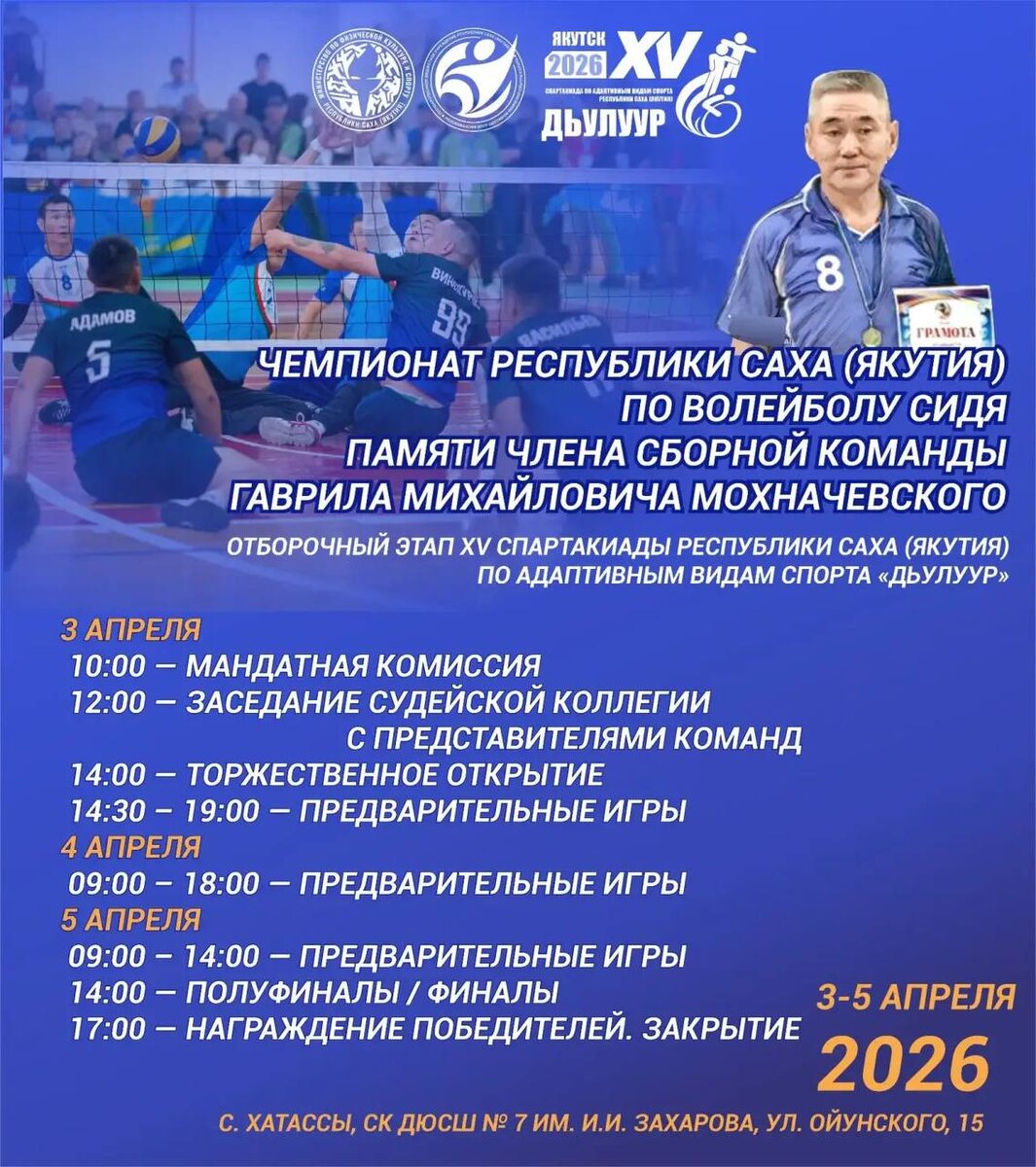 Со 3 по 5 апреля 2026 года в селе Хатассы пройдут соревнования памяти члена сборной команды Гаврила Михайловича Мохначевского. Чемпионат является отборочным этапом XV Спартакиады Республики Саха (Якутия) по адаптивным видам спорта «Дьулуур». 8 сильнейших команд получат путёвки в финал Спартакиады. Программа соревнований: 3 апреля 10:00 — Мандатная комиссия 12:00 — Заседание судейской коллегии 14:00 — Торжественное открытие 14:30–19:00 — Предварительные игры 4 апреля 09:00–18:00 — Предварительные игры 5 апреля 09:00–14:00 — Предварительные игры 14:00 — Полуфиналы / финалы 17:00 — Награждение победителей, закрытие Вход свободный — приходите поддержать спортсменов!