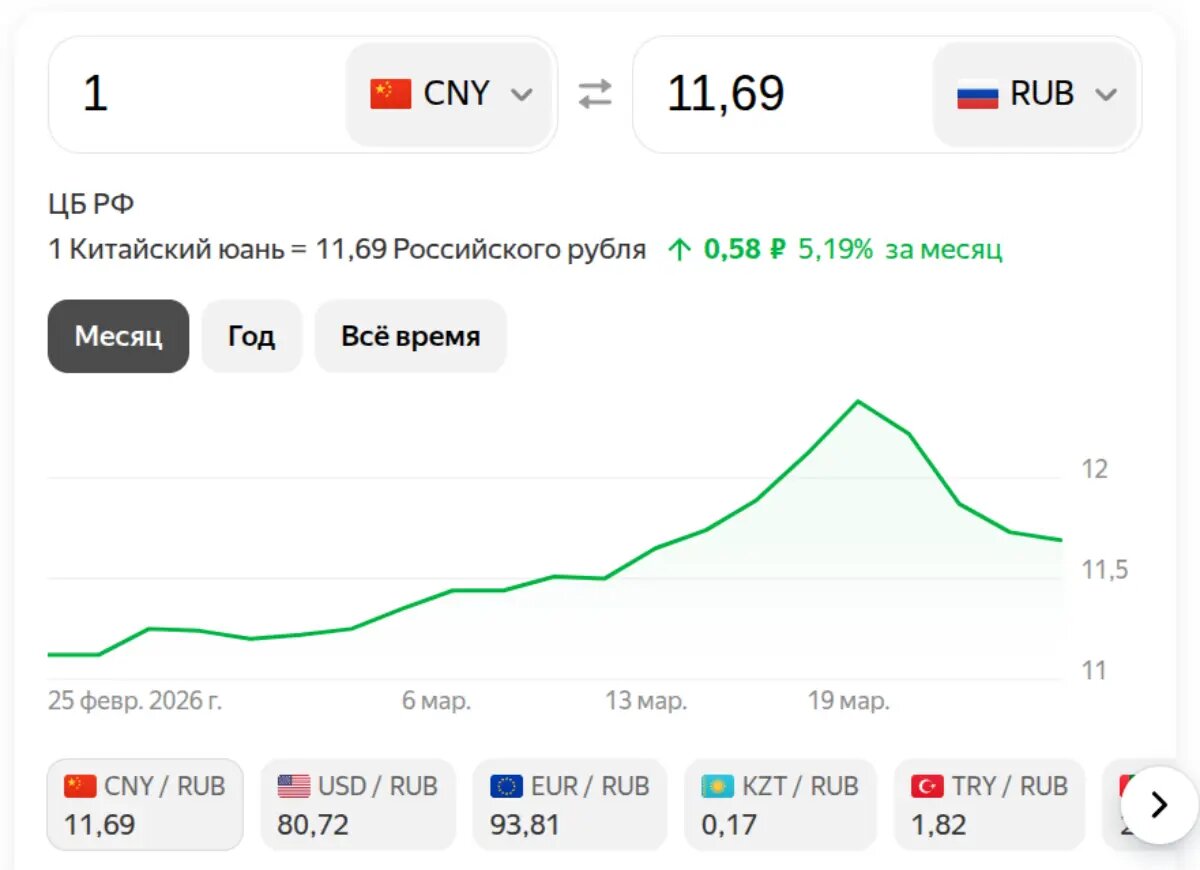 Курс китайского юаня 26 марта 2026 года снизился до 11,69 рубля против 11,73 рубля днем ранее. Незначительное ослабление отражает текущие колебания на валютном рынке и баланс спроса и предложения. Одним из ключевых факторов стало укрепление рубля на фоне роста цен на нефть, которые приблизились к отметке в 100 долларов за баррель. Увеличение экспортной выручки традиционно поддерживает российскую валюту, что оказывает давление на курсы иностранных валют, включая юань. Дополнительное влияние оказывает политика Центральный банк России, который продолжает регулировать ликвидность и валютные операции. В последние годы юань стал одной из основных валют для внешней торговли России, поэтому его курс во многом зависит от расчетов по экспортно-импортным контрактам. Также на динамику влияет ситуация в Китае: умеренные темпы экономического роста и действия Народного банка Китая по поддержке экономики могут сдерживать укрепление юаня на внешних рынках. В целом текущее снижение носит умеренный харак