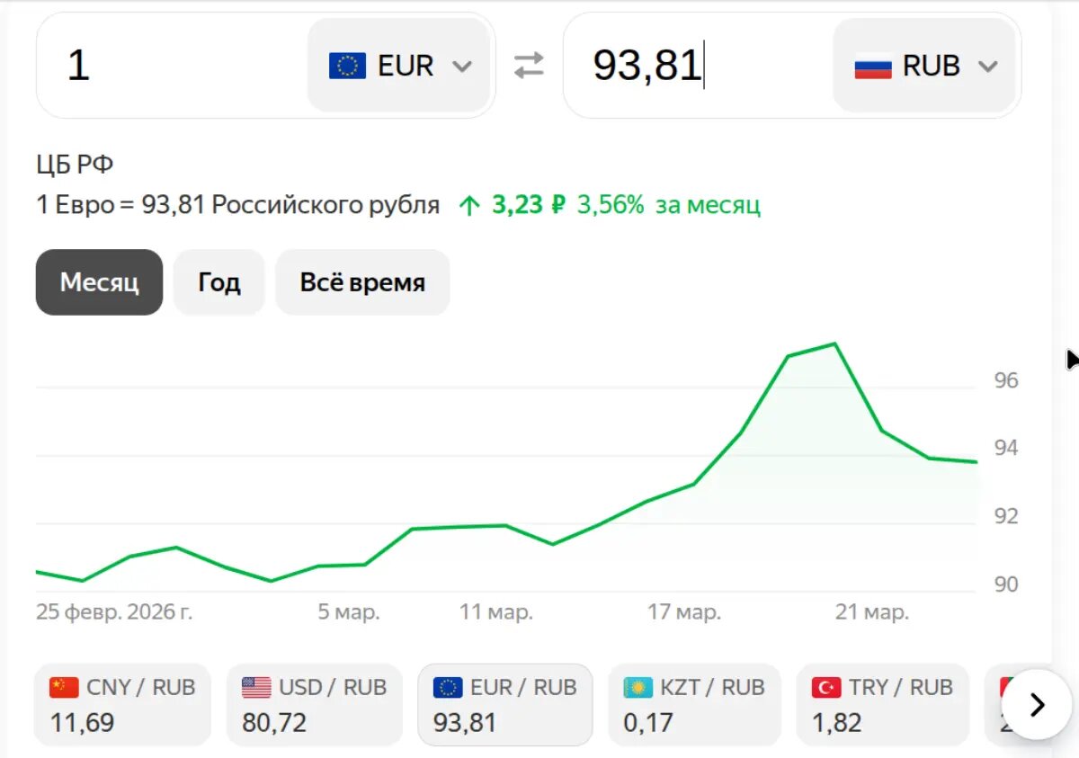Евро опустился до 93,81 рубля на 26 марта 2026 года